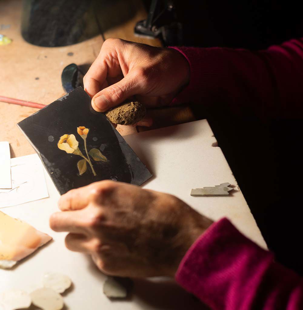 Entering their workshop feels like stepping into a private home, a space where the benches still bear the marks of generations. Here, the Traversari family continues a rare art: shaping stones gathered along the Arno into Florentine commesso, and drawing Murano glass into fine threads for their micromosaics.